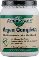 Pure Advantage'snew Vegan Complete (with Multi-GuraD), is a complete Vegan protein meal replacement that will revolutionize Vegan nutrition with its broad spectrum of essential nutrients. vitamins, minerals, and complete proteins. Vegan Complete (with Multi-GuarD) rivals and complete protein powders with an impressive ratio of essential and non-essential amino acids from Pea Protein Isolate and Rice Protein Concentrate. This soy-free product incorporates a wholesome blend of whole grains, fruits, vegetables, enzymes, and Non-GMO proteins that mixes instantly and is available in two great tasting flavors, Vegetable and Vanilla. Vegan Complete (with Multi-GuarD) contains absolutely no animal protein, dairy derivatives, no animal derived nutrients. Enhanced with Multi-GuarD, this product will supply any individual with a foundation of nutrients and an elixir of age-defying anti-oxidants.